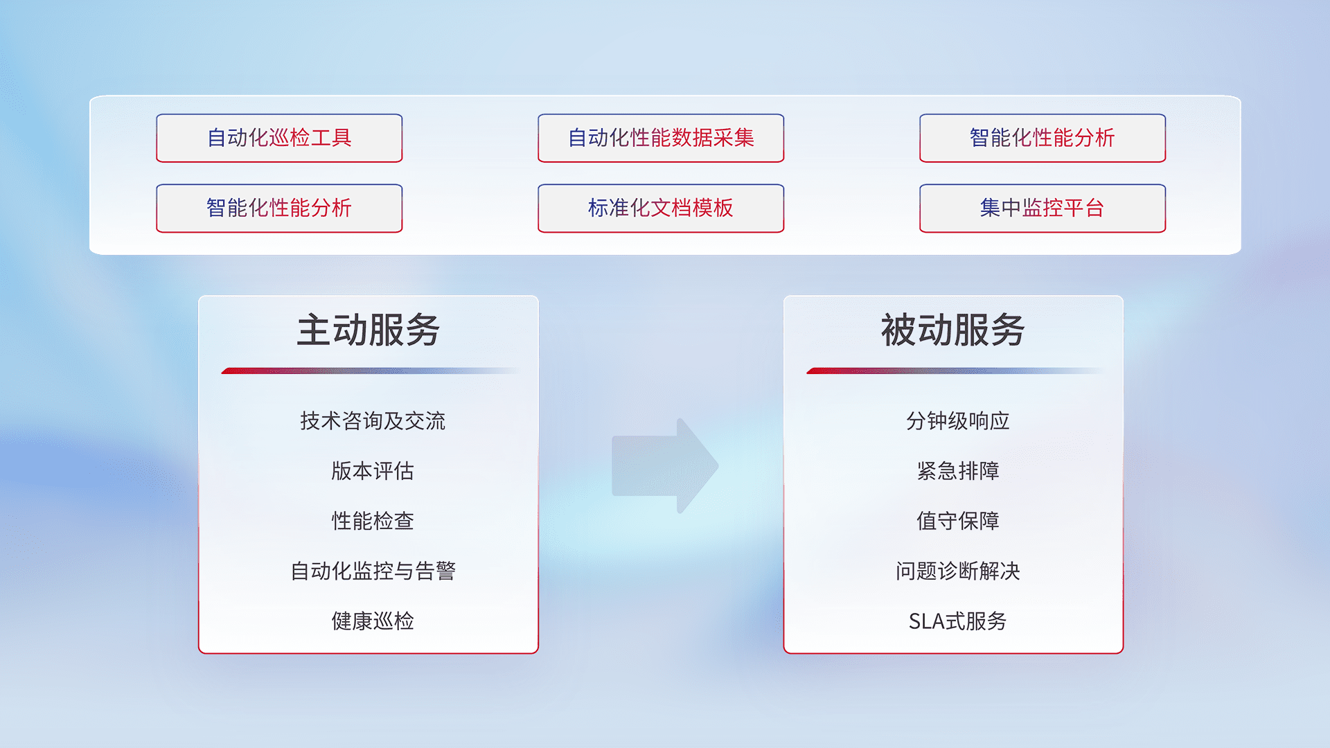 智能化工具和标准化文档,,,保障服务质量,,提供主动服务(包含技术咨询、、、、版本评估、、、性能检查、、、、自动化监控与告警、、、、健康巡检)和被动服务包含(分钟级响应、、、、紧急排障、、、值守保障、、、问题诊断解决、、SLA服务)。。。