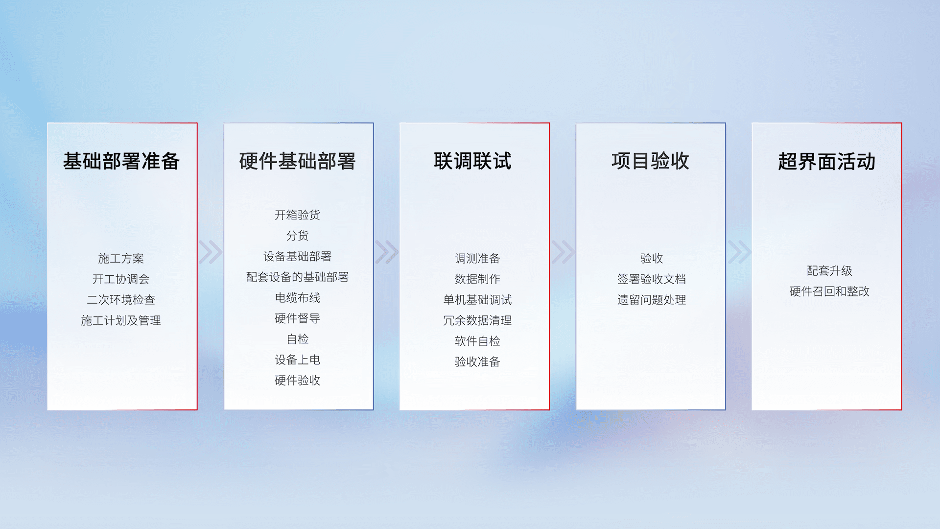 从基础部署准备、、、硬件基础部署、、、、联调联试、、、、项目验收、、、、越界面活动的全过程可追溯,,,保证施工质量和进度。。。。